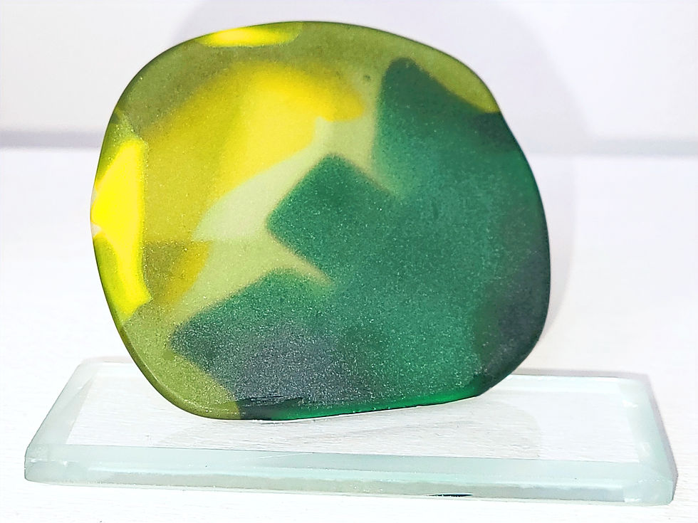 Through kiln-forming techniques and a thoughtful exploration of light, transparency, and texture, she brings depth and tactile presence to these expressive designs.